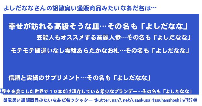 | ヒーロー風カッコイイあだ名 | 『スーパーヨシダナナ』『仮面ヨシダー』 |