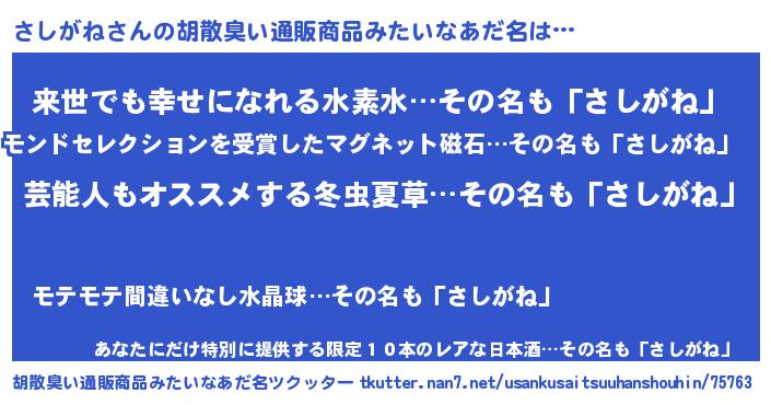 | ポケモン風あだ名 | 『サシセウス』『ゼニサシ』 |