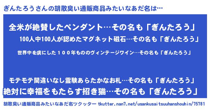| 意味不明あだ名 | 『住所不定無職ぎんたろう(11歳)』 |