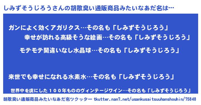 | 男性向けラノベタイトル風あだ名 | 『しみずそうじろうの憂鬱』 |