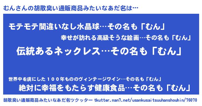 | ヘコむあだ名 | 『むんっぺ』『むんもー』『なまこ酢』 |