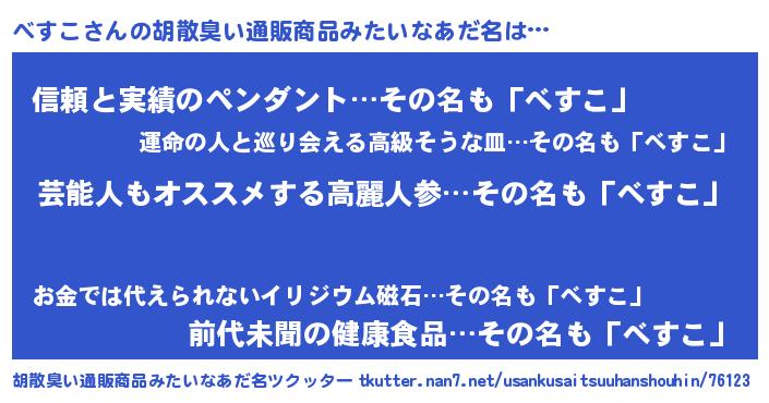 | 男性向けラノベタイトル風あだ名 | 『Re:べすこから始める異世界生活』 |