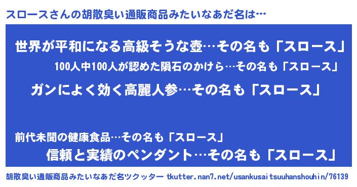 | ヒーロー風カッコイイあだ名 | 『超時空戦士スロース』『暗黒騎士スロ』 |