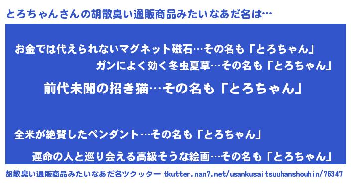 | ヒーロー風カッコイイあだ名 | 『ネオトロチャン』『究極戦士トロチャン』 |