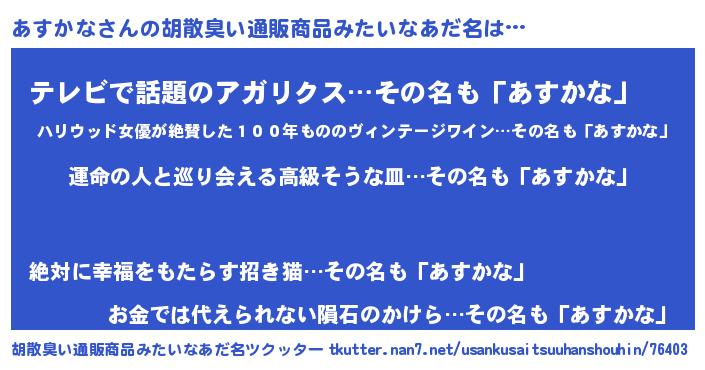 あすかなさんの胡散臭い通販商品みたいなあだ名をツクッター!