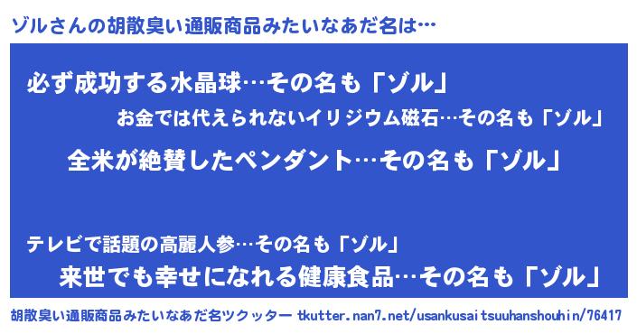 男性向けラノベタイトル風あだ名 | 『ゾルの嫁は女の子じゃないと思った?』 |