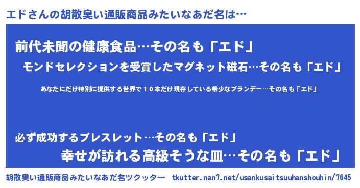 | 男性向けラノベタイトル風あだ名 | 『この素晴らしい世界にエドを!』 |