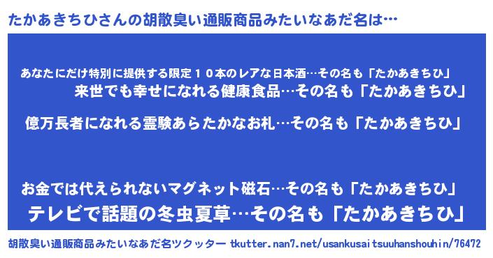 | ヘコむあだ名 | 『たかもー』『たかあきちひ(笑)』 |