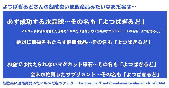 | 男性向けラノベタイトル風あだ名 | 『よつばぎるどという概念が存在しない退屈な世界 』 |