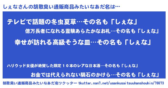 | 男性向けラノベタイトル風あだ名 | 『やはりしぇなの青春ラブコメはまちがっている 』 |