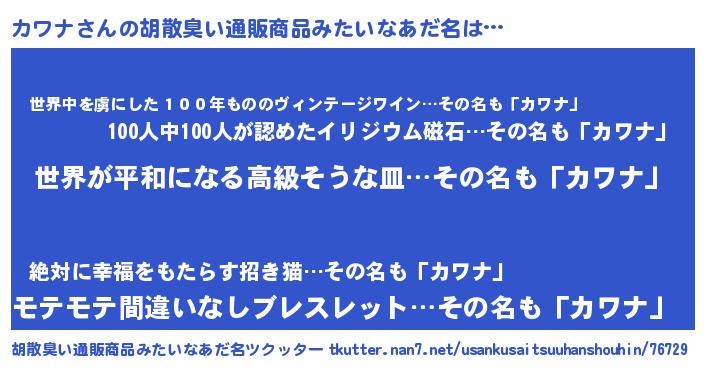 | 意味不明あだ名 | 『カワナフォーエバー』『ペロリンカワナ』 |
