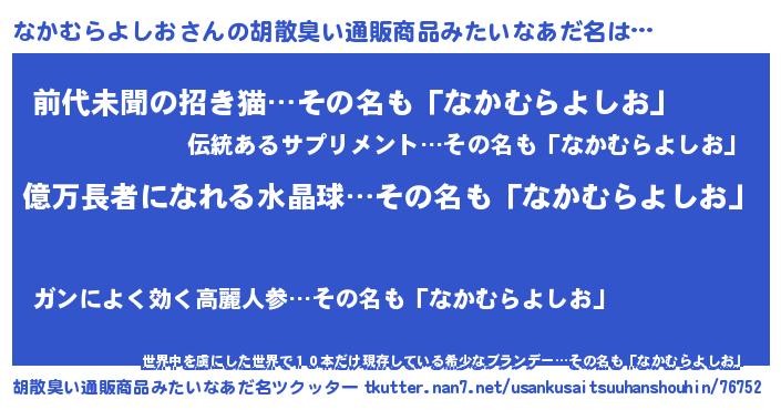 | 男性向けラノベタイトル風あだ名 | 『なかむらよしおに滅ぼされるだけの簡単なお仕事です』 |