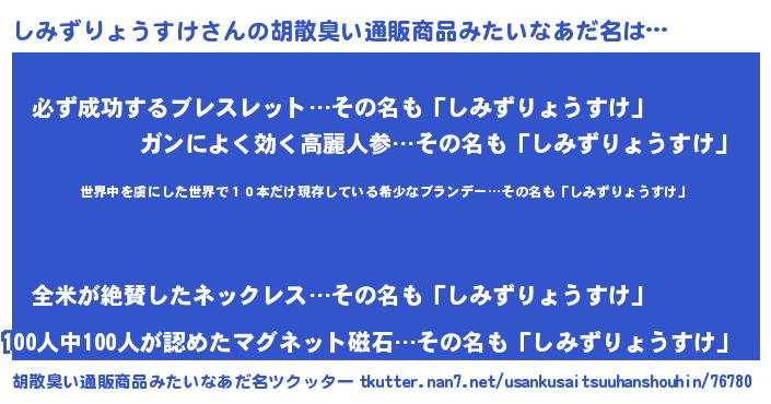 | 意味不明あだ名 | 『住所不定無職しみずりょうすけ(93歳)』 |