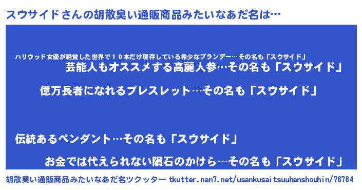 | 男性向けラノベタイトル風あだ名 | 『スウサイド~年齢イコール彼女いない歴の魔法使い~』 |