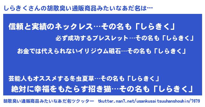 | 男性向けラノベタイトル風あだ名 | 『おまえをオタクにしてやるから、俺をしらきくにしてくれ! 』 |