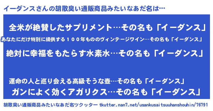 | 男性向けラノベタイトル風あだ名 | 『イーダンスという概念が存在しない退屈な世界 』 |