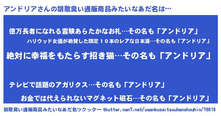 | 意味不明あだ名 | 『永久保存アンドリア』『自称アンドリア』 |