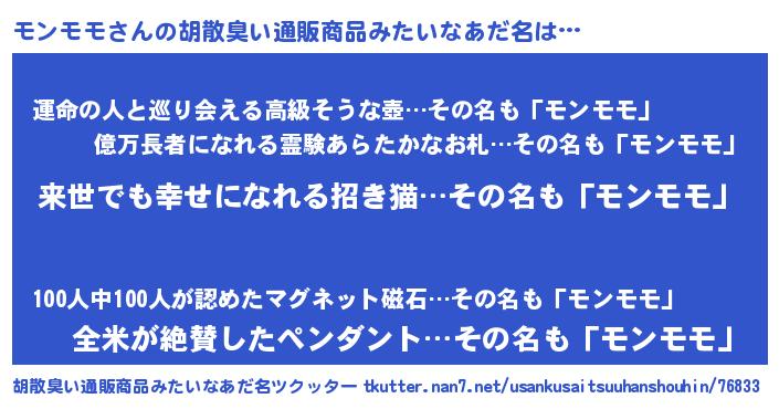 | 意味不明あだ名 | 『永久保存モンモモ』『ペロリンモンモモ』 |