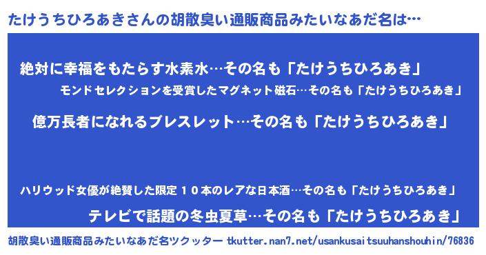 | ヘコむあだ名 | 『たけにー』『たけうちひろあき(震え声)』 |