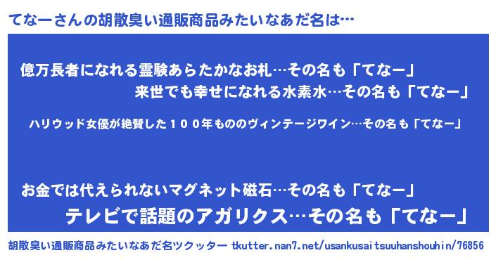 | 意味不明あだ名 | 『住所不定無職てなー(13歳)』『自称てなー』 |