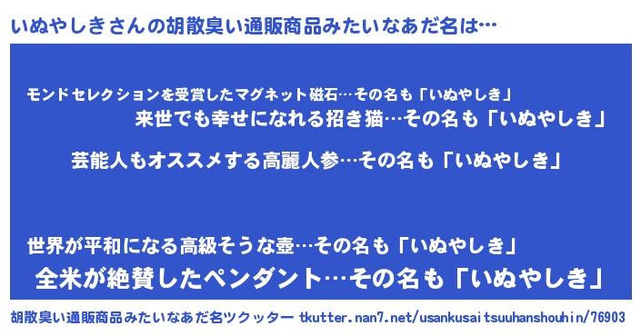 | 意味不明あだ名 | 『自称いぬやしき』『永久保存いぬやしき』 |