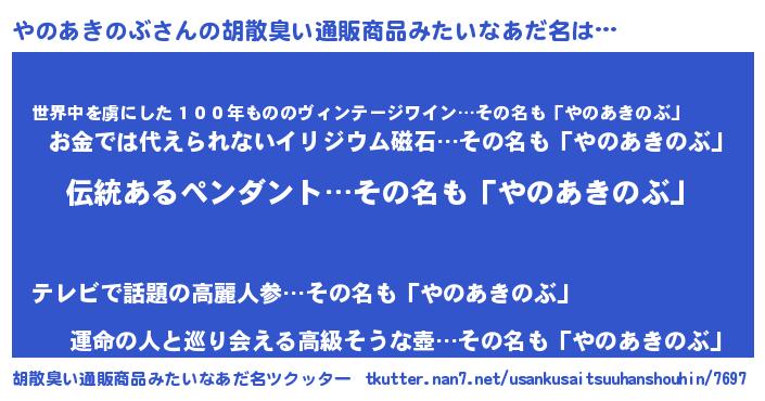 やのあきのぶさんの胡散臭い通販商品みたいなあだ名をツクッター!