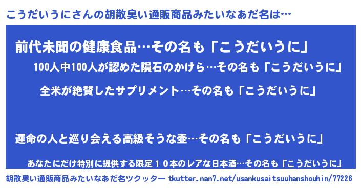| 男性向けラノベタイトル風あだ名 | 『こうだいうにの嫁は女の子じゃないと思った?』 |