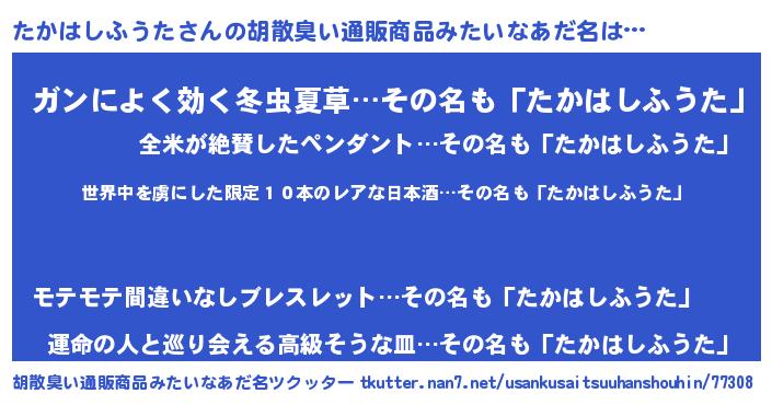 | 男性向けラノベタイトル風あだ名 | 『この素晴らしい世界にたかはしふうたを!』 |