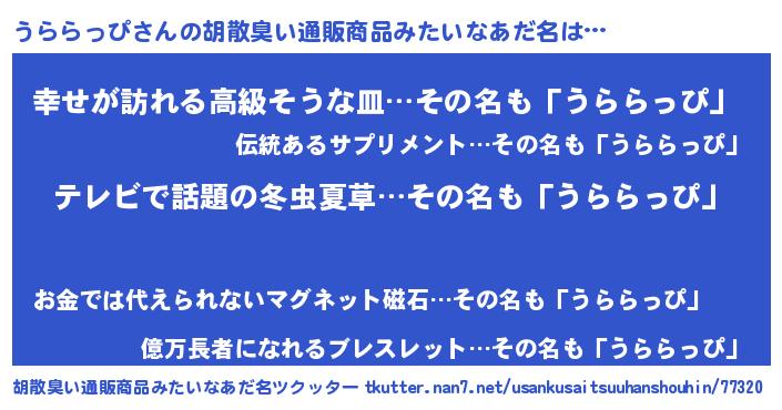 | 意味不明あだ名 | 『自称うららっぴ』『ペロリンうららっぴ』 |