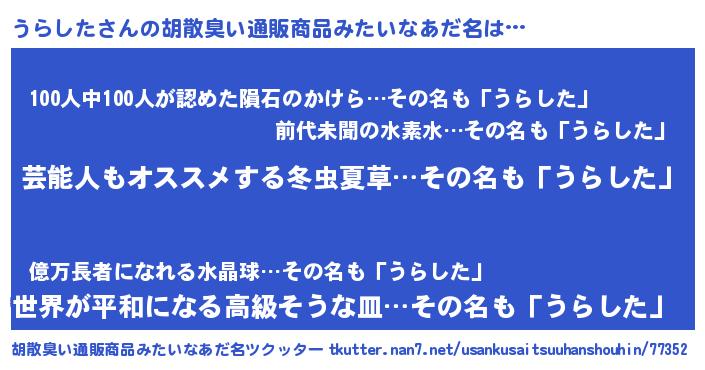 | 男性向けラノベタイトル風あだ名 | 『Re:うらしたから始める異世界生活』 |