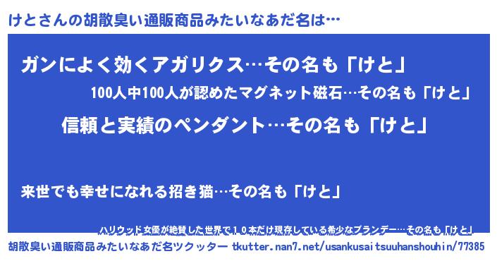 | 女子向けラノベタイトル風あだ名 | 『けとは平凡を望む』『死神けとの再婚』 |