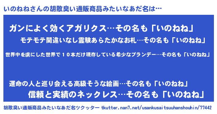 | ヒーロー風カッコイイあだ名 | 『仮面イノダー』『超時空戦士イノネネ』 |