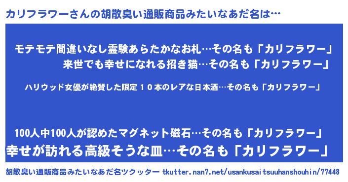 | 男性向けラノベタイトル風あだ名 | 『カリフラワースレイヤー』 |
