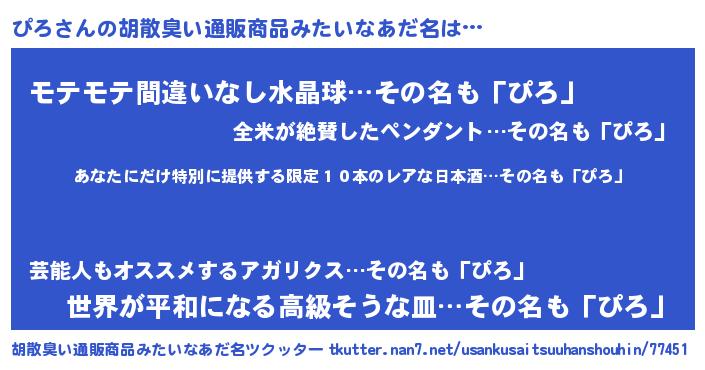 | ヘコむあだ名 | 『ぴろもー』『豆乳』『ぴろぷりん』 |