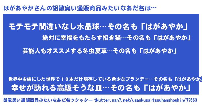 | 伝説のあだ名 | 『封印されしスナイパーはがあやか』 |