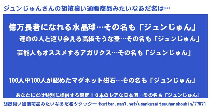 | 恥ずかしいあだ名 | 『ジュンジュンデラックス』『ジュっちょ』 |