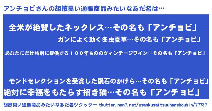 | 意味不明あだ名 | 『住所不定無職アンチョビ(10歳)』 |