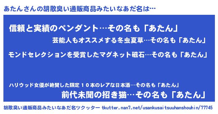 | 女子向けラノベタイトル風あだ名 | 『死神あたんの再婚』『闇のあたん』 |