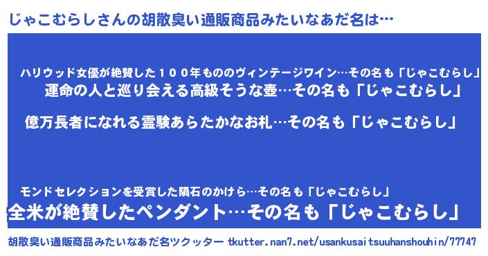 | 男性向けラノベタイトル風あだ名 | 『ジャコムラシアートオンライン』 |