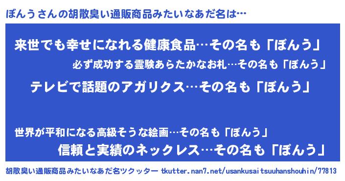 | ヘコむあだ名 | 『ぼんう(苦笑)』『ぼんっ子』 |