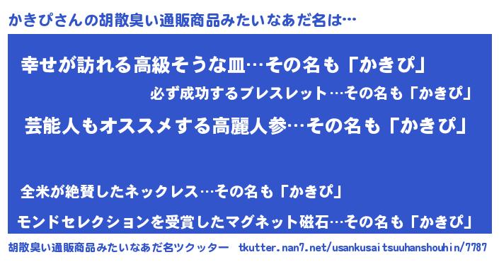 | 意味不明あだ名 | 『自称かきぴ』『つくし科かきぴ属』 |