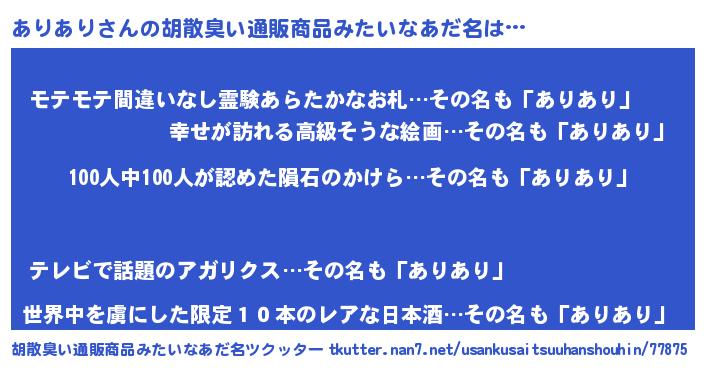 | ヘコむあだ名 | 『ありもー』『豆乳』『ありあり(爆)』 |