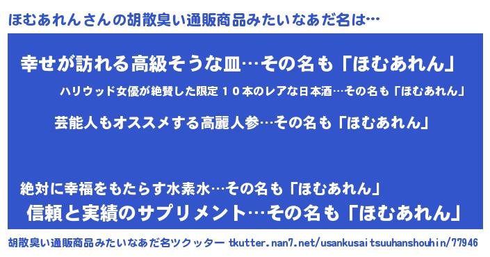 | 男性向けラノベタイトル風あだ名 | 『Re:ほむあれんから始める異世界生活』 |