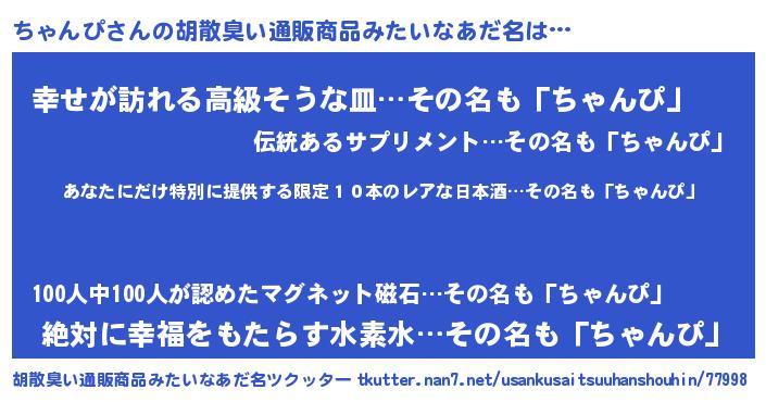 | 男性向けラノベタイトル風あだ名 | 『この素晴らしい世界にちゃんぴを!』 |