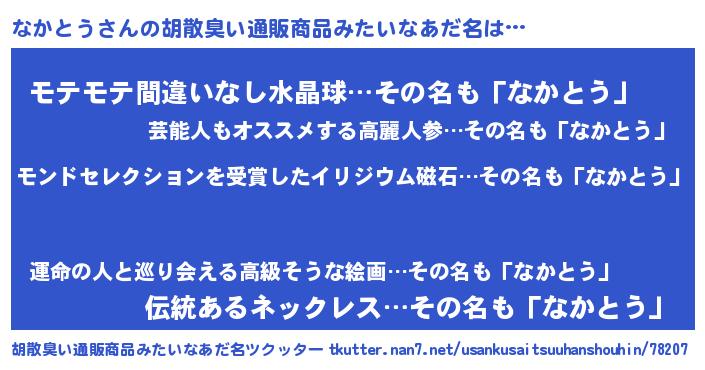 | 男性向けラノベタイトル風あだ名 | 『なかとう~年齢イコール彼女いない歴の魔法使い~』 |