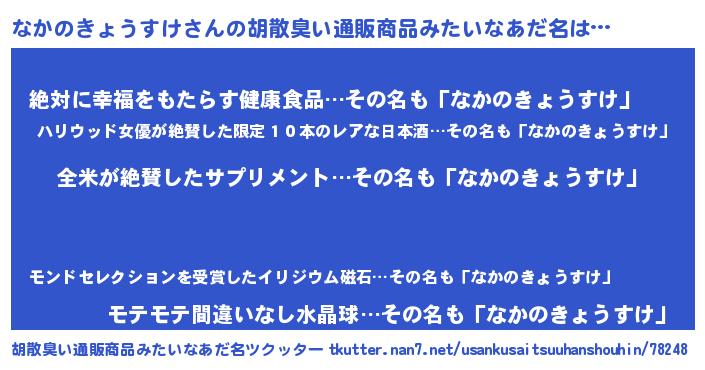 | 男性向けラノベタイトル風あだ名 | 『なかのきょうすけ~年齢イコール彼女いない歴の魔法使い~』 |