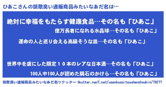 | ヒーロー風カッコイイあだ名 | 『ウルトラひあこマン』『ネオヒアコ』 |