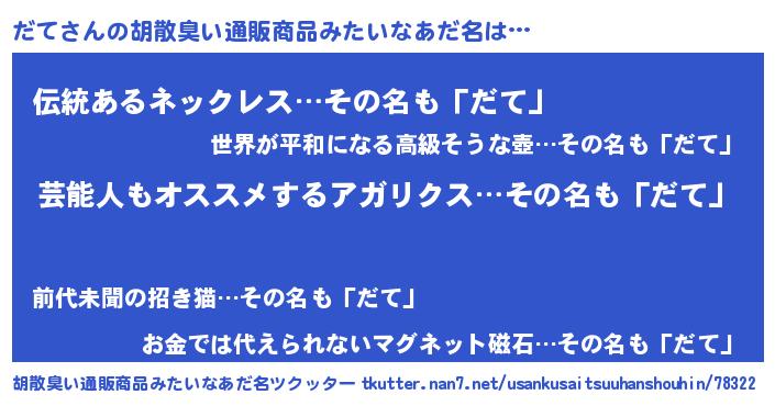 | 意味不明あだ名 | 『自称だて』『とにかく怪しいだて』 |