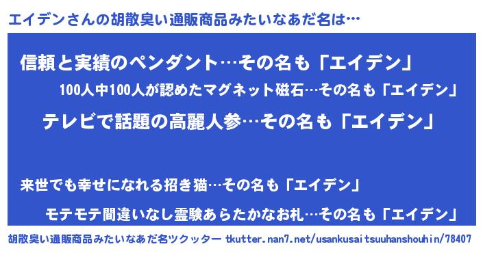 | 意味不明あだ名 | 『なめこ科エイデン属』『自称エイデン』 |