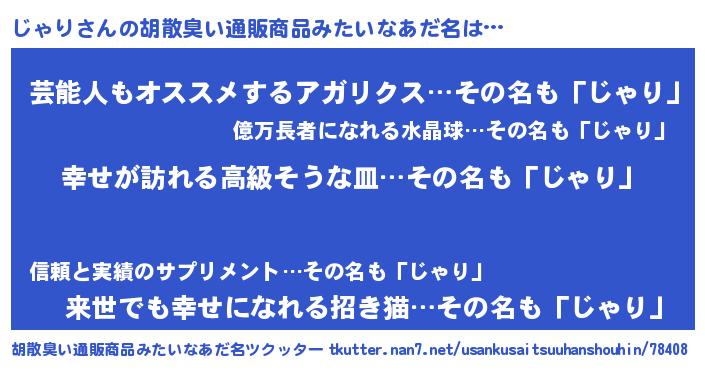 | 女子向けラノベタイトル風あだ名 | 『じゃりの雑貨屋さん』『闇のじゃり』 |